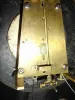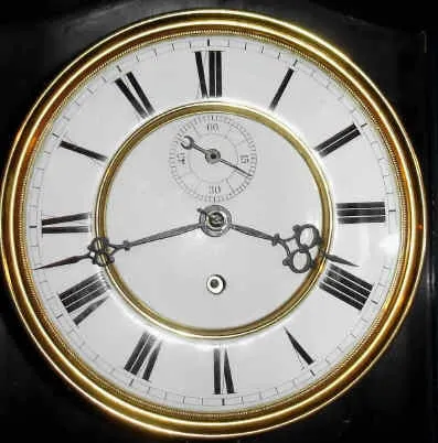 Condition: Ebonized case in clean condition with some wear to the original finish. Top trim is new, made up of various hobby parts, bottom bracket sprayed black. Porcelain dial is perfect and hands are original Spun brass dial bezel has some dents. Pendulum bob has some dents and dings. Finials are modern. Empty holes in case back near top. Interestingly, this movement has 40 teeth in the escape wheel, and thus the seconds bit does rotate once a minute [unlike Beckers] Old front glass. Ht. 42"