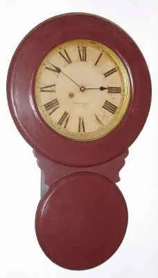 C.1892, Baird Clock Co., Plattsburgh, NY, former ad clock now with lettering removed and both doors sanded and painted brown. Condition: although the case is hardly worth restoring, the dial, original movement, hands and pendulum are proper for a Baird and the dial is in exceptionally nice condition. Our estimate is for the movement and dial, hands, pend. Ht 31"