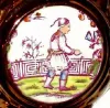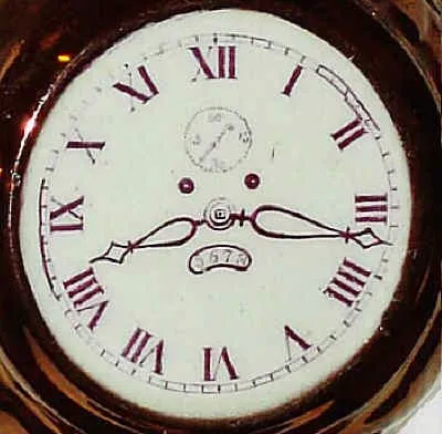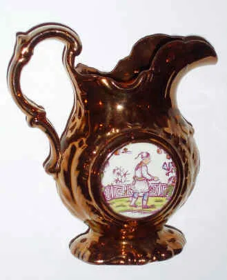 C.1890, English, Copper Loster Pitcher, with a clock face on one side, and a Japanese man in his garden on opposite side. There are 3 small chips on the spout of the pitcher. Hard to find item. Ht 6"