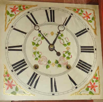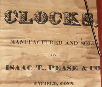 C.1835, Isaac T. Pease, Enfield, Ct, Stenciled Column and Splat,, 30 hour wooden works, with restored tablet. Condition: the tablet has been painted in a primitive NH style with gold border, not normal for this model, ivory escutcheon is missing from the door. There is a 2" piece of veneer missing on lower door edge. Label is nice (and uncommon). Ht 31"