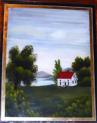 Condition: the tablet has been painted in a primitive NH style with gold border, not normal for this model, ivory escutcheon is missing from the door. There is a 2" piece of veneer missing on lower door edge. Label is nice (and uncommon). Ht 31"