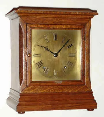 C.1905, German, Winterhalder and Hofmeier, oak cased, small square dial bracket or mantel clock, gong striking, 8-day. Condition: the golden oak case was refinished some time ago, and is clean, one small scrape on door. The well made and robust movement is in need of a cleaning, fully wound, not ticking. Movement is signed W and H, Sch. Brass dial needs silvering. Nice quality. Ht 9.75