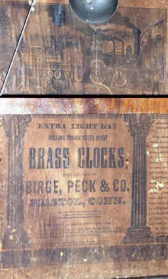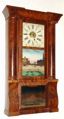 C.1850, Birge, Peck and Co., 8-day time/strike/alarm column and cornice shelf clock, strap brass movement. Condition: Refinished mahogany veneered case in nice clean condition with a couple of veneer chips on the base Both tablets are original with some losses. Original painted dial is pretty clean with some minor loss at the mounting pins. This clock has an alarm and set disc that appear to have been added later, and could be removed. Ht. 32.5"