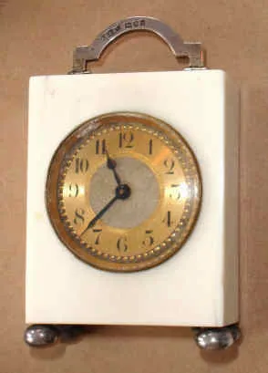 C.1900, French, Mini Carriage Timepiece, the case of ivory, and the feet and handle of sterling, 8-day. Condition: there is a small chip in the glass crystal at 11; otherwise the clock is in excellent original condition, and the movement is running. Note this is a lever escapement built into the rear plate rather than on a separate platform, and is very well done. Dial = 1.6" Ht 3.6"