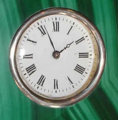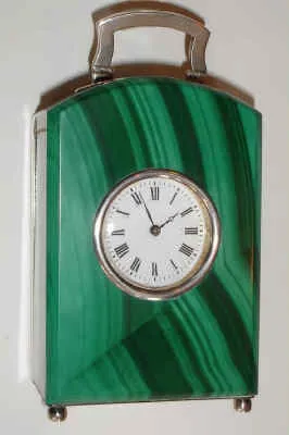C.1905, French, Mini Carriage timepiece, 8-day, wound from rear with hinged key, jeweled lever platform, the case of sterling, quartz and malachite. Condition: each piece of silver is hallmarked. Stone is in excellent condition, with only minor edge abrasion. Porcelain dial is perfect; minute hand replaced. Uses a miniature rectangular movement. Handle marked "C.B. and Sons" Runs OK. Ht 4.4" handle up.