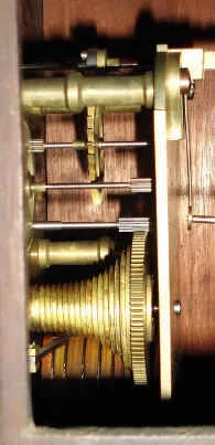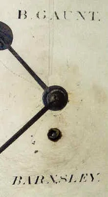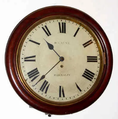 Condition: mahogany case is in excellent original condition, including finish. The orig painted dial is in good condition, with only minor discoloration and small flake near 8; dial is signed by retailer: B. Gaunt, Barnsley. Hands are original. The movement is now driven by cable. Retains original pendulum. ht 18"