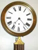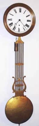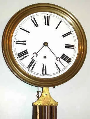 Condition: the center hand is absent, however replacements are available from Timesavers.com. The pendulum has some pits and dents; the gridiron has some surface rust. There are some hairlines on the porcelain dial around 10:30; no repairs. Movement is complete and sound and ticks despite dirt and dried oil. Diameter of bezel = 14" Total ht = 52"