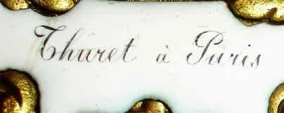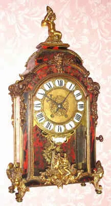 C.1890, French, Boulle Clock, in the style of a century earlier, the dial with a signet signed Thuret, Paris; inlaid brass into shell veneer and with cast bronze mounts, the brass dial with 12 individual porcelain signets with Roman numerals. Condition: overall very good original condition, both the red shell and brass inlay nicely intact with only minor losses. The well made gong striking movement bears a serial number and the city "Paris". This has been one of the most enduring French styles, with modern versions made even today. Ht 23.5"
