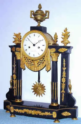 C.1830, French, Mathieu, a' Rouen, Empire Style Portico clock, black marble and ormolu, and with a large round movement with silk thread suspension. Condition: the porcelain dial has had a central chip repaired, signature is undamaged and strong. On both sides, under the slender urns, there is a missing gilt element, and with some damage where the stud pulled out (only noticed on close inspection). The bell strike movement is clean and running briskly. Ht 22.5"
