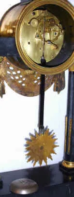 C.1830, French, Mathieu, a' Rouen, Empire Style Portico clock, black marble and ormolu, and with a large round movement with silk thread suspension.