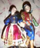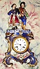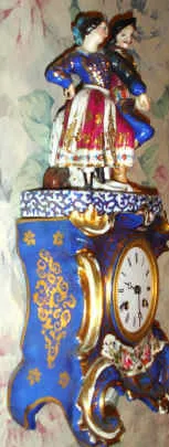 C.1850, French, Porcelain Mantel clock, two piece, with costumed lovers on top, the base color blue cobalt accented with gold highlights and floral displays. The silk thread bell strike movement with countwheel, 8-day. Condition: the rear dust cover of brass is from another clock, but suffices. Otherwise this clock is in excellent original condition with clean porcelain dial and no chips nor breaks in the case. It is likely that this clock spent most of its life under a dome. Ht of both pieces = 15.75"