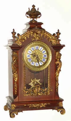 C.1878, German, Lenzkirch, Bracket clock, in walnut case with many pieces of bronze trim, 8-day, gong strike, serial No. 646874, retailed by Hofuhrmacher, Kaufingerstrasse 18 [Munich?] Condition: overall very good original condition, a dry split in case above 12. This clock has sat in place for many years, and regular dusting has removed much of the gilding on the ormolu trim, however all the pieces are present and the case is in extra nice shape. Bronze pieces include top finials, side caryatids, feet, crest, door trim and base trim. Has a heavy cast brass dial with individual cartouche numerals, and original pierced steel hands. Original gilt sunburst pendulum shows through glass in front door. Retailers label on bottom. For a nearly identical model, see 150 Yahre Lenzkircher Uhren [2001], page 74, only the bottom front trim is different; note we find 2 others sold, identical to ours. Ht 21.3"