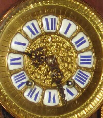 Condition: overall very good original condition, a dry split in case above 12. This clock has sat in place for many years, and regular dusting has removed much of the gilding on the ormolu trim, however all the pieces are present and the case is in extra nice shape. Bronze pieces include top finials, side caryatids, feet, crest, door trim and base trim. Has a heavy cast brass dial with individual cartouche numerals, and original pierced steel hands. Original gilt sunburst pendulum shows through glass in front door. Retailers label on bottom. For a nearly identical model, see 150 Yahre Lenzkircher Uhren [2001], page 74, only the bottom front trim is different; note we find 2 others sold, identical to ours. Ht 21.3"