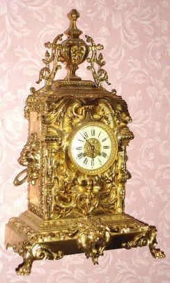 C.1890, French, Large Brass Mantel clock, profusely decorated with torches and urns and with 3 lions [sides and lower front]. 8-day, striking.