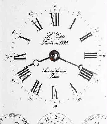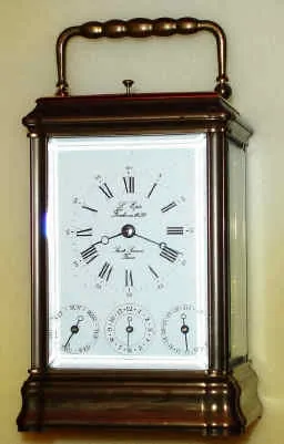 C.1980, French, L'Epee, Brass Cased carriage clock, time, strike, alarm and repeat, with calendar at bottom of the dial, with a bronze finish to the case (modern). Condition: has been in storage for a while; repeats and strikes, however running weakly, needs a cleaning. Calendar is functional when rotating hands manually. Days of week are in English, alarm dial in center, date on right. Original platform is intact. Ht 7"