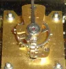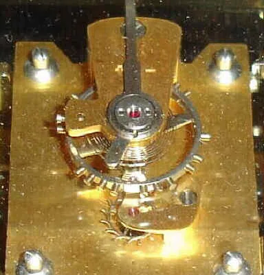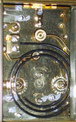 Condition: has been in storage for a while; repeats and strikes, however running weakly, needs a cleaning. Calendar is functional when rotating hands manually. Days of week are in English, alarm dial in center, date on right. Original platform is intact. Ht 7"