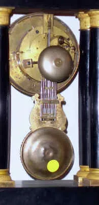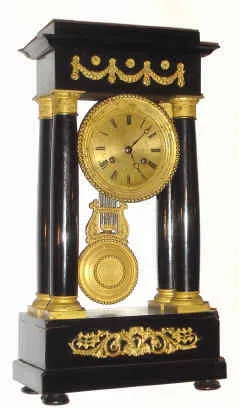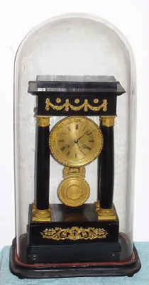 C.1860, French, "F-C", 4-Column Empire style mantel clock, in an ebonized case with gilt bronze mounts, (swags and floral elements) gilt dial and pendulum, and with original glass dome and base. Condition: overall very good original condition, runs and strikes. See smaller foto with dome. Ht of clock = 18" with dome and base = 26" (dome is 24")