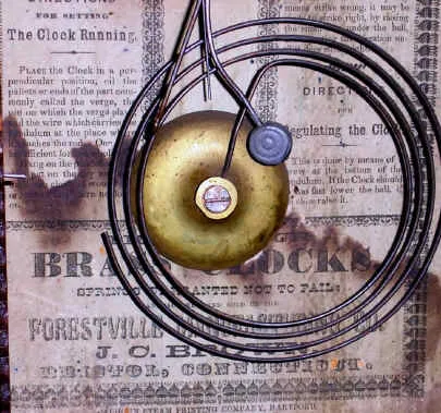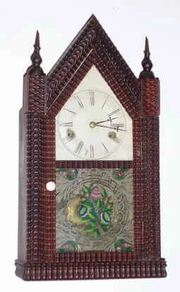 C. 1848, J. C. Brown, Forestville Manufacturing Co., Bristol, Conn., miniature ripple steeple clock with its original signed 30-hr time and strike movement. Condition: The clock is in excellent original condition. Both glasses are original and held in with their original wood strips, nice floral design on lower. The dial has its original paint, no signature remaining. The label is complete with water stains. The hands, bone door knobs are original. The mahogany case is in excellent condition with older/original finish. Ht 16"