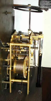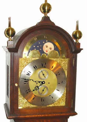 Condition: brass dial has been nicely polished and with touch up to moon dial. Otherwise this clock is in excellent original condition. Movement has been professionally cleaned and running briskly; has Graham's dead beat escapement and Harrison's ratchet maintaining power. Finish on case is original. Quality item. Ht 93.5 "