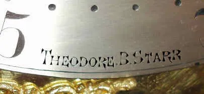 C.1900, English, for Theodore B. Starr, New York, rolling moon, time and strike brass dial tall clock, in an English oak case. Condition: brass dial has been nicely polished and with touch up to moon dial. Otherwise this clock is in excellent original condition. Movement has been professionally cleaned and running briskly; has Graham's dead beat escapement and Harrison's ratchet maintaining power. Finish on case is original. Quality item. Ht 93.5 "
