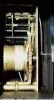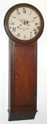 C.1820, Bates (Jos), Huddersfield, oak cased time and bell strike tavern clock with 14" painted dial; week duration. Condition: the dial is flaking quite a bit and will perhaps need some stabilizing. The robust bell strike movement has been professionally cleaned and re-strung and is running briskly. The case has an old finish, but probably not original; the bezel at top has a horizontal dry split. The bell and hammer extend out a hole in top of case and there is an old hinged tin cover that has been fashioned to keep dust out of the case. Ht 51"