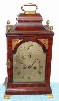 C.1790, English, George III Mahogany bracket clock with ormolu mounts, 2-fusee, bell strike, with engraved back plate, converted from crown/verge to anchor escapement. Condition: there are some chips in the veneer here and there, pendulum is absent, silvered/engraved dial has some tarnish and wear. No signature on movement nor dial. Robust movement now with cable in lieu of gut; dirty, needs service, but ticking/striking. Ht 21"