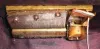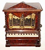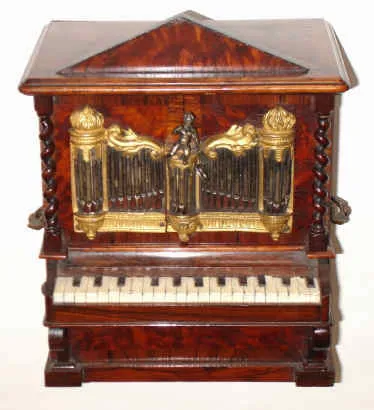 C.1860, Swiss or Austrian, Musical Jewel box in the form of an organ, two drawers locked behind the rank of silvered brass pipes attached to the front doors. Music is actuated by simply pressing the keyboard, when it plays one of 2 tunes and stops; key-wound from the rear. Condition: some of the painted keys have been repaired and re-painted. The veneer on the organ is a colorful burl and in excellent condition. Note also the little man with a flute on the central stack of pipes. Orig inside mirror is cracked. Cylinder = 3" width of organ = 8" ht 11"