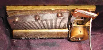 Condition: some of the painted keys have been repaired and re-painted. The veneer on the organ is a colorful burl and in excellent condition. Note also the little man with a flute on the central stack of pipes. Orig inside mirror is cracked. Cylinder = 3" width of organ = 8" ht 11"