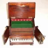 C.1860, Swiss or Austrian, Musical Jewel box in the form of an organ, two drawers locked behind the rank of silvered brass pipes attached to the front doors. Music is actuated by simply pressing the keyboard, when it plays one of 2 tunes and stops; key