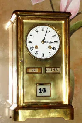 C.1900, French, S. Marti, Crystal Regulator with Calendar: month and day of the week on rollers in the American style, and the date on a silk ribbon, 8-day, bell strike, platform lever movement. Condition: overall good original condition; note rollers have damage and the "day" roller has discolored scotch tape holding it; month roller shows wear but is OK, the silk date ribbon has been replaced, however the original ribbon is inside case for comparison. The porcelain dial is fine and the hands are original. The calendar spring is wound with the key through a hole in the left glass; month can be advance by key through hole in right glass. Movement is fully wound, striking fine. Balance staff is intact, but time will not run without pressure on minute hand, needs service. Uncommon. Ht 11.3"
