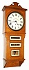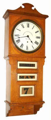 Condition: The dial has been nicely restored. The light oak case appears to retain its original finish. The original month, day and date papers have darkened with age, mostly the day roller, but are excellent. A new piece of cardstock has been placed around the glass openings - that was originally gold leaf. Full information on Henry S. Prentiss and his unique patent mechanisms can be found in Tran Duy Ly's book titled Calendar Clocks, pages 216-221. Ht 37"