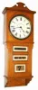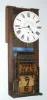 C.1897, Prentiss Calendar and Time Co., New York, "EMPIRE", calendar timepiece, 30 day duration, with separately wound "thrasher" mechanism with two rollers carrying month and day and the dates on individual cards. Condition: The dial has been nicely restored. The light oak case appears to retain its original finish. The original month, day and date papers have darkened with age, mostly the day roller, but are excellent. A new piece of cardstock has been placed around the glass openings - that was originally gold leaf. Full information on Henry S. Prentiss and his unique patent mechanisms can be found in Tran Duy Ly's book titled Calendar Clocks, pages 216-221. Ht 37"
