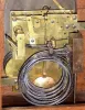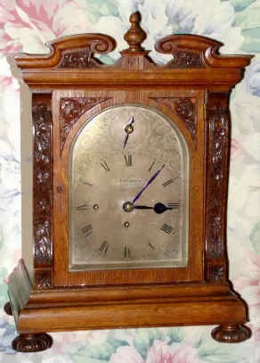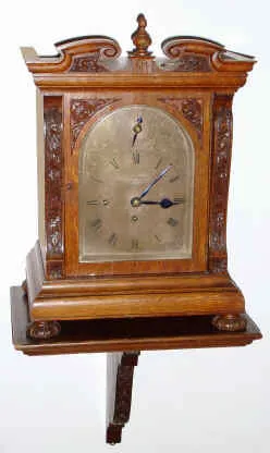 Condition: the robust movement ticks and chimes, however the oil has gone dark and will need service soon. The dial has lost some of its black wax and brass is showing through in a couple of places. Hands, pendulum, gongs, door locks and all case hardware are original on this. Oak case has been nicely rubbed out and waxed over old finish; cornice moldings have been re-glued and doweled in place. A heavy and well made clock . Carving on bracket front matches case. Ht of clock = 19.5", overall = 32"