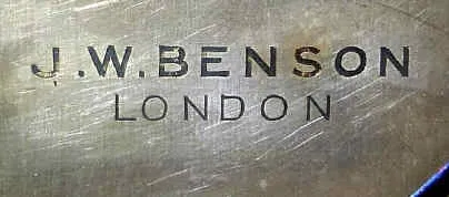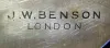 C.1900, English, J. W. Benson, London, 3-fusee, Westminster chime on large flat wire gongs, with the hours struck on a large cathedral gong, with a silvered brass dial with foliate engraving in the arch and spandrel areas, and with F/S adjust in the arch, plus original wall bracket. Condition: the robust movement ticks and chimes, however the oil has gone dark and will need service soon. The dial has lost some of its black wax and brass is showing through in a couple of places. Hands, pendulum, gongs, door locks and all case hardware are original on this. Oak case has been nicely rubbed out and waxed over old finish; cornice moldings have been re-glued and doweled in place. A heavy and well made clock . Carving on bracket front matches case. Ht of clock = 19.5", overall = 32"