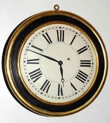 Condition: this timepiece has been restored, the bezel painted black, and 2 rings gold leafed ad accent. The wooden dial has been repainted. Seems to run fine. The dial plate = 14" , case diameter is 19.5"