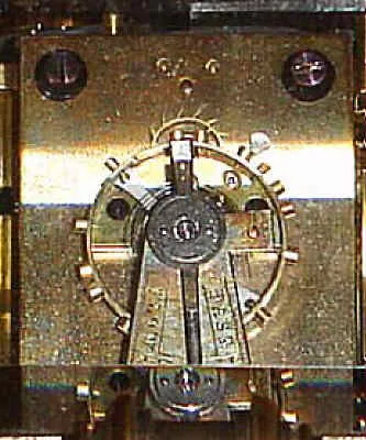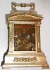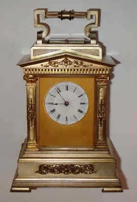 C.1890, French, Brass Cased Carriage clock, in a large architectural case w/ pediment top, with tu-tone gilding, each corner with square columns and Corinthian capitals on each, dentil molding all 'round the top and cast floral decorations below the roof line, and on all 4 sides of the base; time, strike and repeat, 8-day with original platform. Condition: there is some oxidation where the very top meets the peaked roof and wear to gilding on high spots; otherwise in very nice and original condition. Ht 9"