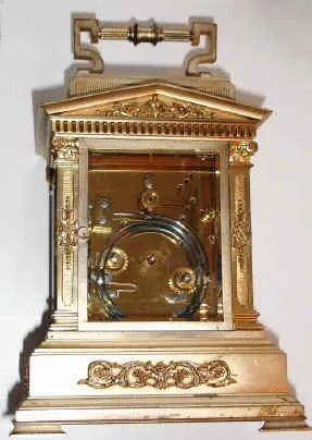 C.1890, French, Brass Cased Carriage clock, in a large architectural case w/ pediment top, with tu-tone gilding, each corner with square columns and Corinthian capitals on each, dentil molding all 'round the top and cast floral decorations below the roof