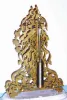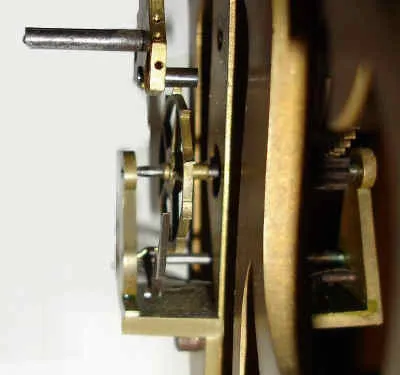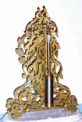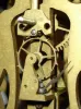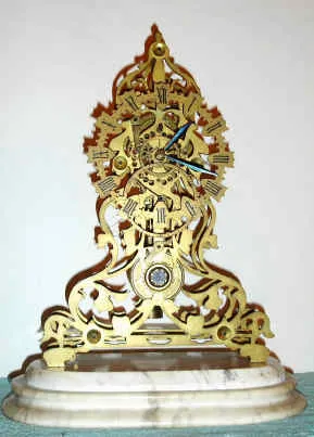 Condition: an amateur restorer has left a serious one with some work to do. Needs a proper set of hands a proper pendulum, and needs work on the pivoted detent ['scape wheel is wired for transport]. Despite the restoration needed, this is an uncommon clock, and there is extensive information in Derek Robert's book titled British Skeleton Clocks, pages 150 + 151, and then again on pgs 168-69, which include a drawing that will assist you in the restoration. Note the detent arbor and arm itself is there; missing are the blade and passing springs. Would be $4000 if complete/running. Ht of frame = 15", overall on marble base 17""