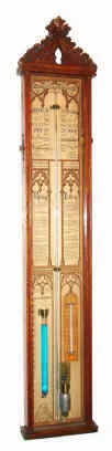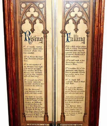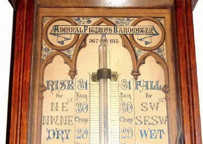 C.1880, English, ADMIRAL FITZROY'S BAROMETER, in an oak case with carved top. Printed paper instruction give full details on use of the instrument, which includes a thermometer and an indicator for height of the atmosphere in miles.