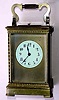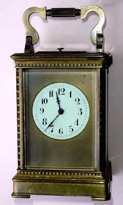 C.1900, French, Brass Cased Carriage Clock in a stylized Anglaise case with turned quarter columns at each corner, and rippled molding top and bottom, time, strike and repeat, 8-day. Condition: screws to carry handle are loose and should be attended. There are a couple dozen small dings in the top of the case where a child beat on the clock with a toy, and top rear corner is dimpled from a fall. Hour hand is replaced. The original lever platform is intact, the dial is perfect, and the clock is running and striking. Ht 7.5"