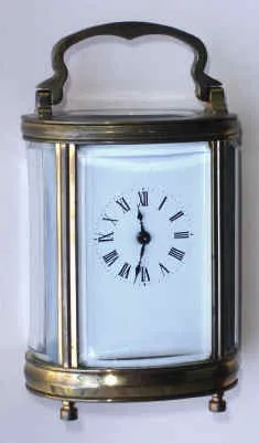 C.1910, French, Brass Cased Carriage timepiece, in a miniature oval case. Condition: excellent overall condition, with original lever platform, all beveled glass is good and dial is perfect. No dings or detractions. Ht 4.25"