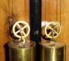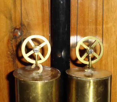 C.1870, Austrian, Schonberger in Wien, mini 2-weight Vienna Regulator, in a transitional style case. Condition: the old top is from another clock, fit to this case, and finials are modern. The weights are cut down from a larger size and have thick brass bottom caps. Dial grommets absent. Various bits of small trim have been replaced on the case. The movement is original and retains original pendulum and pulleys. Ht 34"
