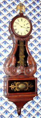 C.1850, Massachusetts Lyre over Box banjo clock, weight driven, 8-day.