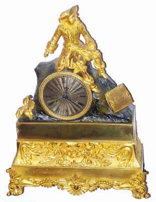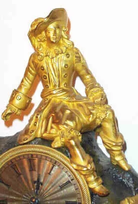 C.1840, French, Bronze and Ormolu Figural clock of a gentleman in 1820's ruffled pantaloons, a feather in his hat and fancy boots. At his feet rests a docket of papers, with clasps. He is resting on a "rock" which contains the clock. Condition: overall very good original condition, with bright yellow gilding and fine details. Movement is clean and running. Ht 14"