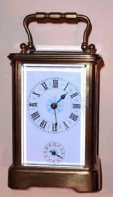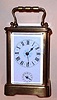 C.1900, French Brass Cased Carriage timepiece with alarm, and with a fancier dial with blue accents, in a Corniche case. Condition: Clock has been recently cleaned; the minute hand is replacement, a bit too small. Cylinder/ platform is intact. Porcelain dial and all glass are perfect. Ht 5.8"