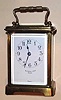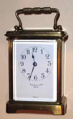 C.1910, French, Brass Cased Carriage timepiece, in a late "Obis" case of stamped brass, made for N. G. Wood and Sons, Boston, both dial and movement signed. Condition: the old minute hand is a replacement and does not match the hour hand. Beveled glass is all good and dial is perfect. Cylinder platform is intact. Ht 5.5"