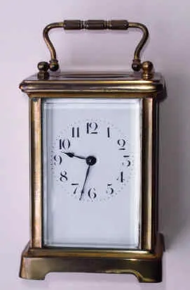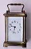 C.1900, French, Brass Cased Carriage timepiece, in a Corniche case and with cylinder platform. Condition: recently cleaned and running, the minute hand has been changed and does not match hour hand. Left front foot portion of base is bent. Beveled glass is all good and dial is perfect. Ht 5.7"