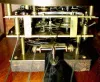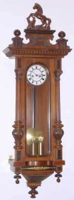 C. 1880, Austrian, J. Piskataschen, Graz movement, in another small case of the same period, and now mounted to a block of wood in the case back. Length is OK and clock keeps time. Dial is small for a 2-wt = 4.5". Condition: there is a sever dry split in the front of the door. Top is from another clock; horse is a modern plaster casting. Enjoy as is, or use parts for restoration. Neat size. Ht 42"