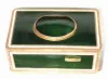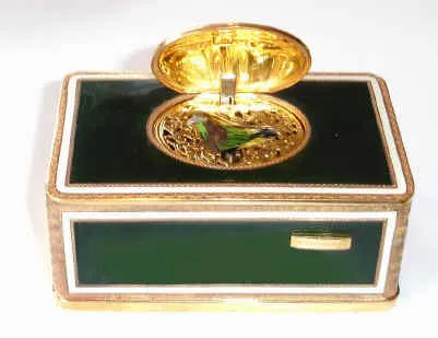 Late 20th Century, German/Swiss, singing bird box in a dark green enameled case, with engraved and gilded corners and edging.