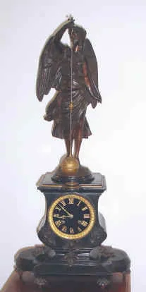 Condition: the index finger of the Angel has been broken away for a long time; only visible on close inspection. The original arrow to drive the pendulum has been replaced with a wire; works fine. Otherwise, in very good original condition. Ht 25"